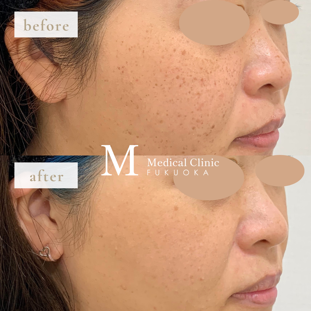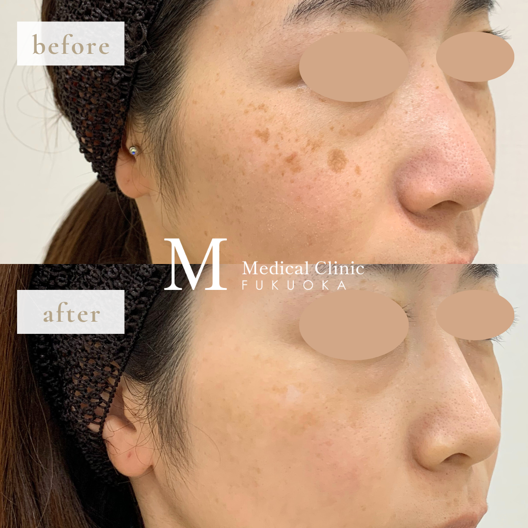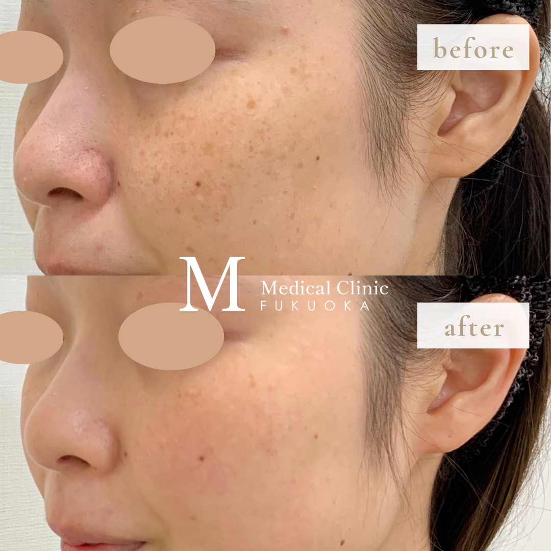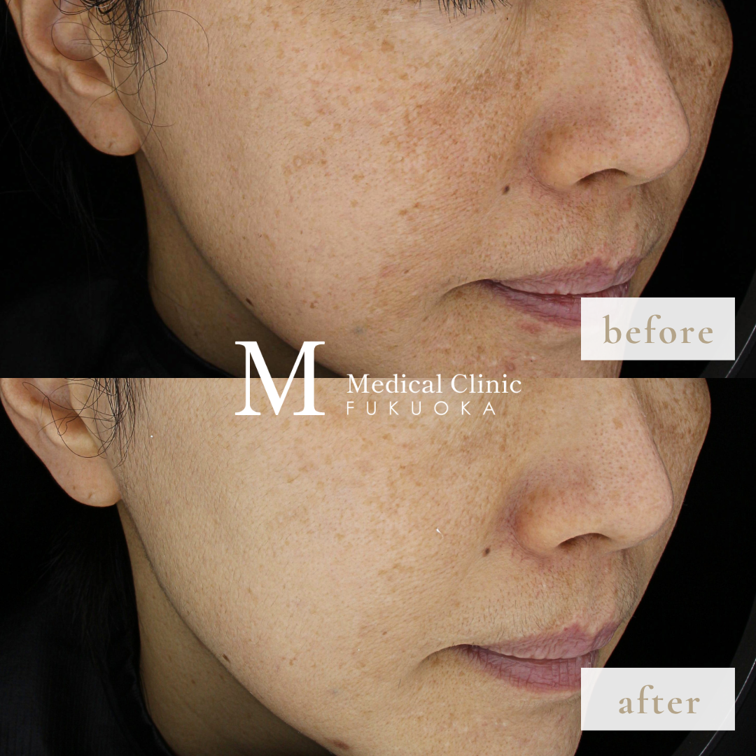 頬全体の濃いシミが気になり、月に1回のペースで3ヶ月間通いました。以前はコンシーラーを3度重ねていましたが、今は1度塗りでカバーできるほどに。肌全体のトーンも2段階明るくなった気がします。