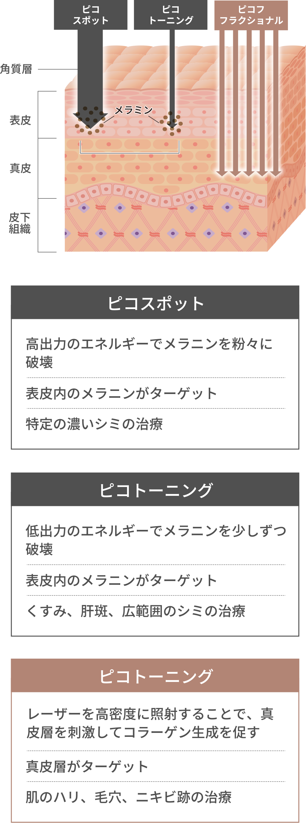 ピコレーザー治療では、ピコトーニング、ピコフラクショナル、ピコスポットという3つのアプローチから、患者様に適した治療法を選択します。これらの3つのアプローチを切り替えることにより、多岐にわたる肌の悩みに対応することが可能です。