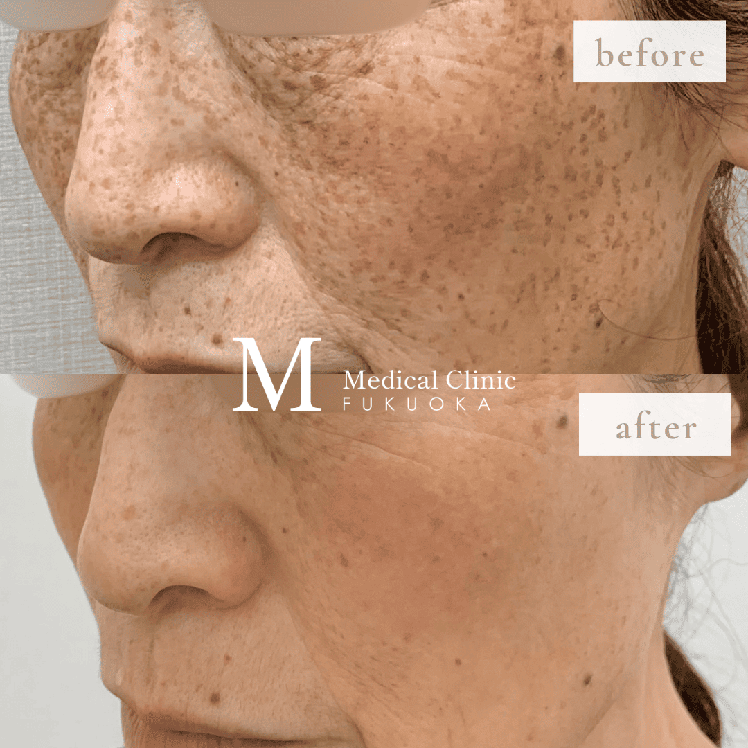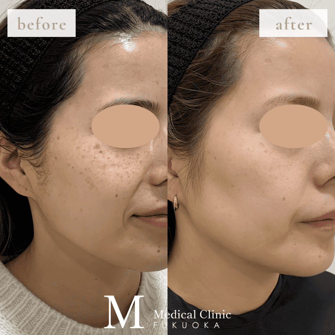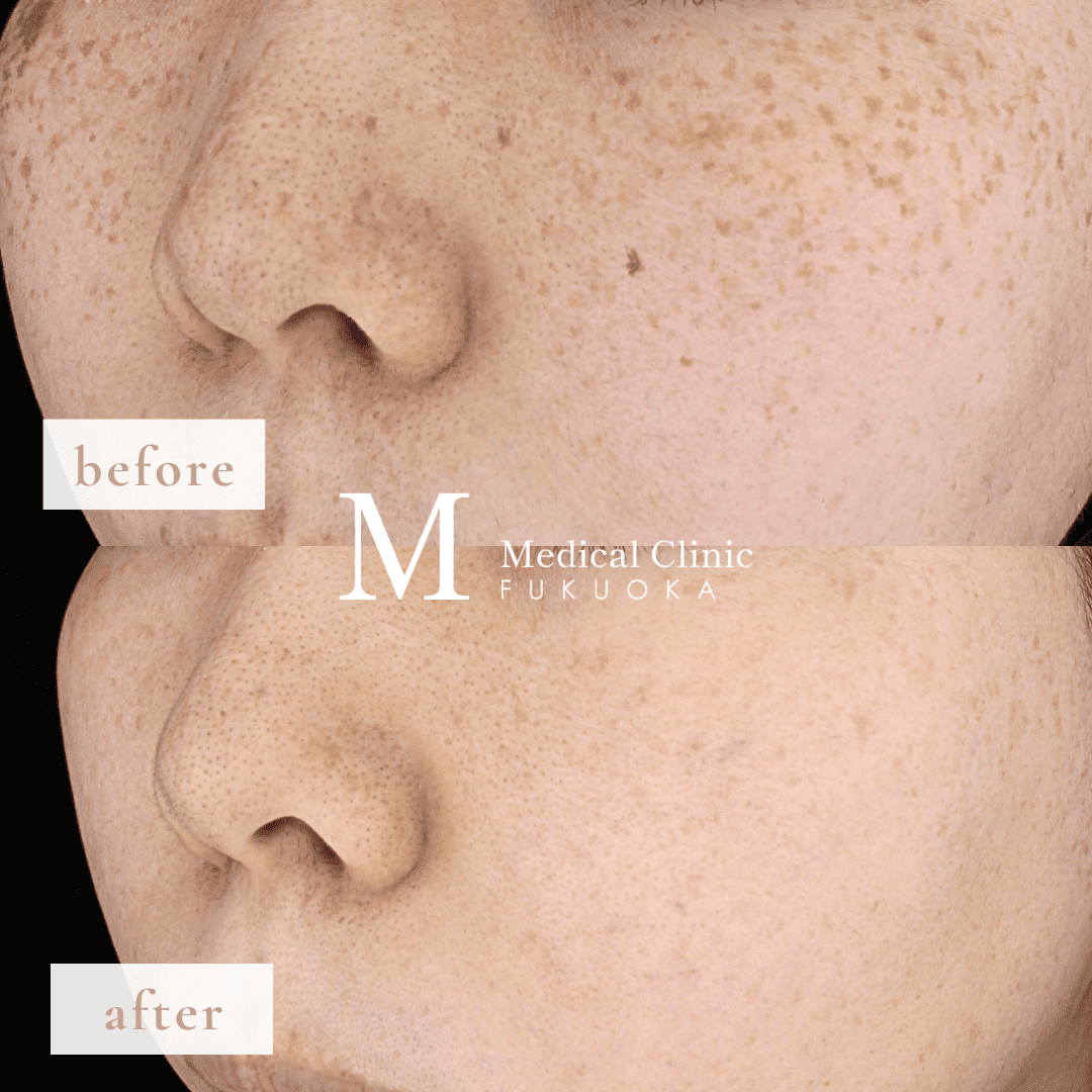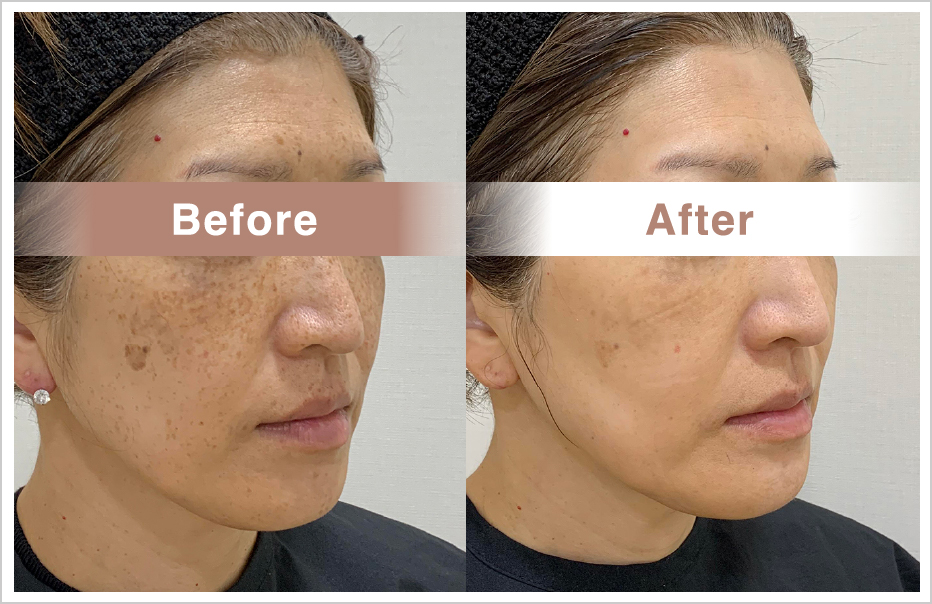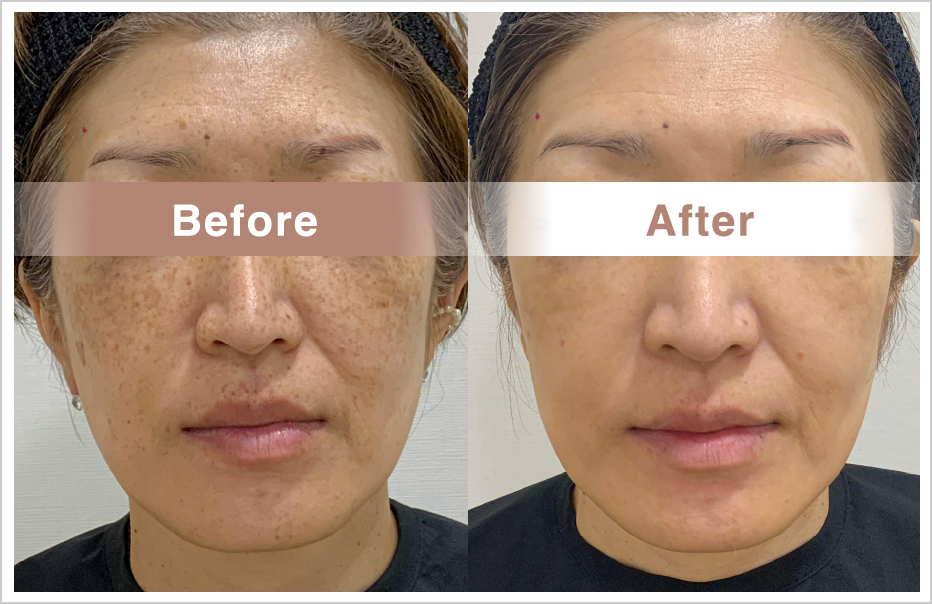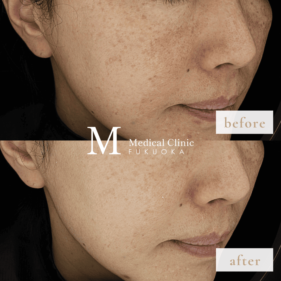 シミやお肌の状態にもよりますが、月に1回の治療を6クール、多い方で1年程度集中してご継続頂くことで、シミの改善だけでなく、お肌の内側から変化し、ハリ、弾力、透明感のあるお肌を作ります。