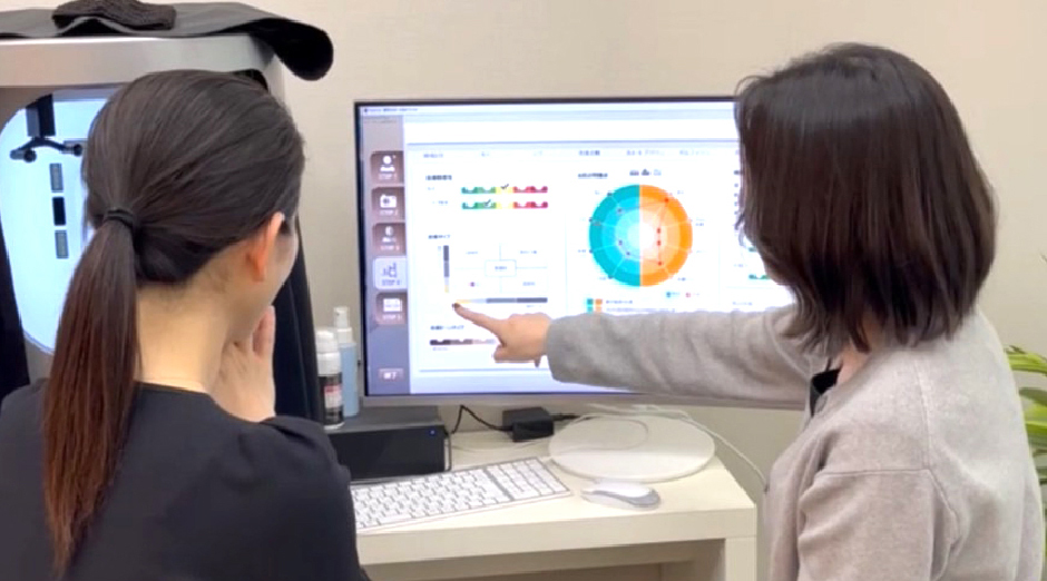 シミ、しわ、毛穴、赤みなど、お肌の細部を分析機で確認。治療途中でも分析を行い、こまめに医師と経過を確認しながら進めていきます。