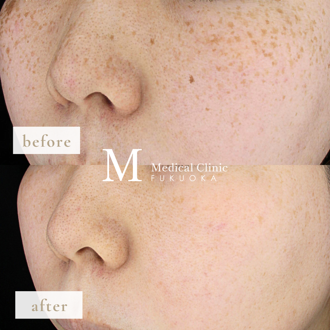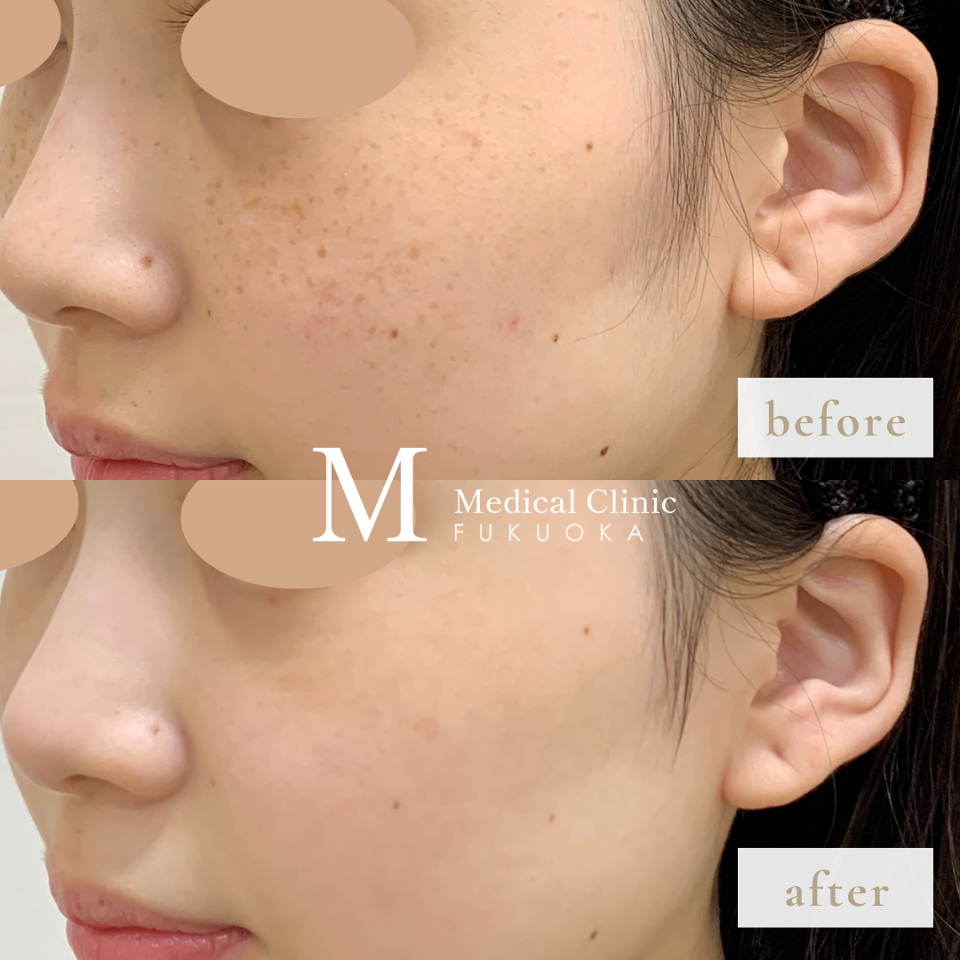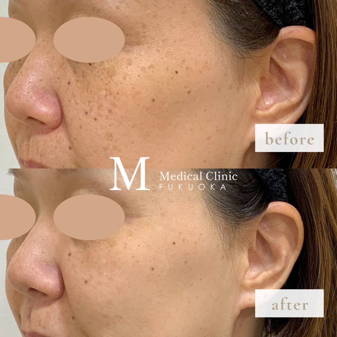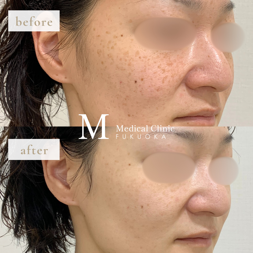頬全体の濃いシミが気になり、月に1回のペースで3ヶ月間通いました。以前はコンシーラーを3度重ねていましたが、今は1度塗りでカバーできるほどに。肌全体のトーンも2段階明るくなった気がします。